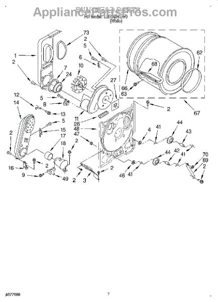 This is a drum assembly intended for use with dryers. This part can be found inside the dryer and is responsible for holding clothing while a cycle is running. It holds wet laundry while loading the appliance. Over time and with use, the drum assembly can start to wear out. This can cause the dryer to squeal, start and stop during a cycle, make buzzing noises, or seize up.If the drum assembly is damaged, it will need to be replaced. Make sure to have basic tools and a pair of work gloves ready. The dryer should be turned off and unplugged from the wall. Raise the top panel, remove the front panel, and then remove the drum. The drum support roller should be taken out and installed on the new drum. Reinstall with the new component and reassemble all parts before use.The drum assembly is made to be used with dryers and washer/dryer combos from Inglis, Estate, Admiral, Crosley, Roper, Magic Chef, Amana, KitchenAid, Maytag, Kenmore, and Whirlpool. It is a genuine OEM replacement part that is sourced directly from the manufacturer. The part is sold on an individual basis.