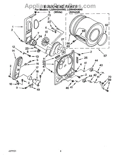 Replacement drum front bulkhead for dryers. Installs at the front of the drum assembly. Needed when original is cracked, damaged, or worn out.
