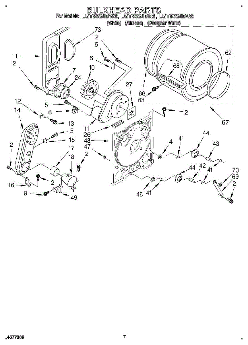 Replacement drum front bulkhead for dryers. Installs at the front of the drum assembly. Needed when original is cracked, damaged, or worn out.