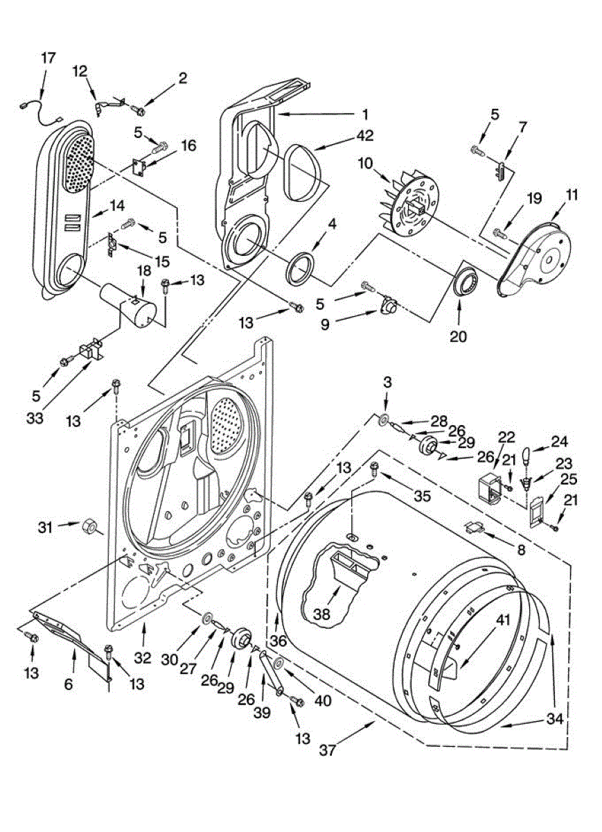 Seals the rear drum edge to contain hot air and improve drying efficiency. Replace if worn, torn, or causing noise. Confirm fit with your model number.