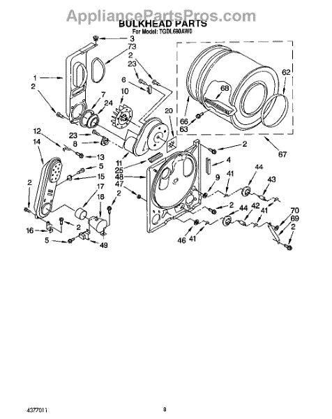 This is a drum assembly intended for use with dryers. This part can be found inside the dryer and is responsible for holding clothing while a cycle is running. It holds wet laundry while loading the appliance. Over time and with use, the drum assembly can start to wear out. This can cause the dryer to squeal, start and stop during a cycle, make buzzing noises, or seize up.If the drum assembly is damaged, it will need to be replaced. Make sure to have basic tools and a pair of work gloves ready. The dryer should be turned off and unplugged from the wall. Raise the top panel, remove the front panel, and then remove the drum. The drum support roller should be taken out and installed on the new drum. Reinstall with the new component and reassemble all parts before use.The drum assembly is made to be used with dryers and washer/dryer combos from Inglis, Estate, Admiral, Crosley, Roper, Magic Chef, Amana, KitchenAid, Maytag, Kenmore, and Whirlpool. It is a genuine OEM replacement part that is sourced directly from the manufacturer. The part is sold on an individual basis.