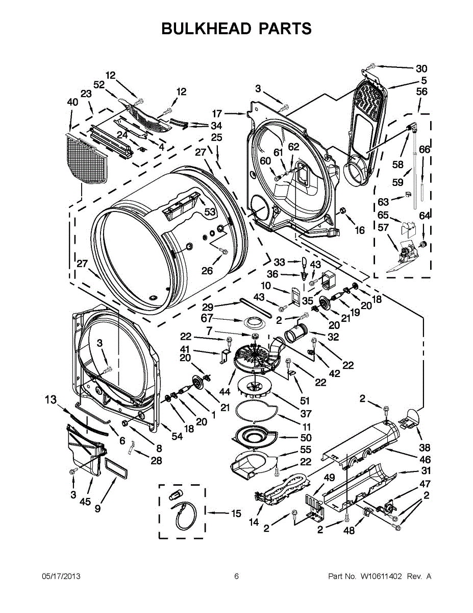 Front bulkhead assembly centers your dryer drum and mounts the bearing and seal. Replace if corroded, warped, or damaged to restore alignment and reduce noise.
