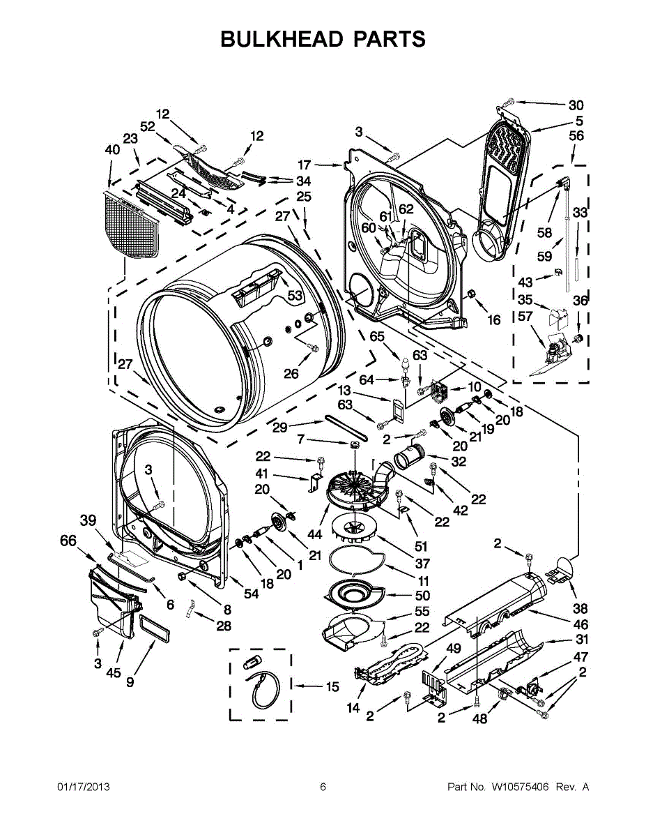 Front bulkhead assembly centers your dryer drum and mounts the bearing and seal. Replace if corroded, warped, or damaged to restore alignment and reduce noise.