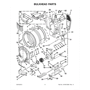 This bulkhead is the front structural panel that supports the dryer drum and seals the front of the cabinet to maintain proper airflow and drum alignment. Replacing a worn bulkhead restores stable drum rotation and prevents air leaks. What it does: