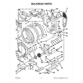 This bulkhead is the front structural panel that supports the dryer drum and seals the front of the cabinet to maintain proper airflow and drum alignment. Replacing a worn bulkhead restores stable drum rotation and prevents air leaks. What it does: