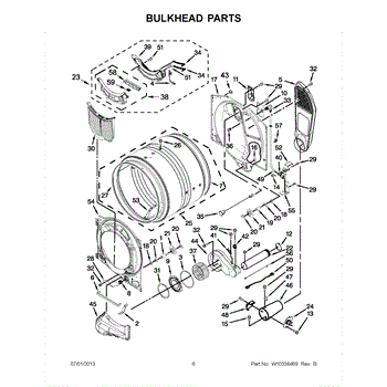 This bulkhead is the front structural panel that supports the dryer drum and seals the front of the cabinet to maintain proper airflow and drum alignment. Replacing a worn bulkhead restores stable drum rotation and prevents air leaks. What it does: