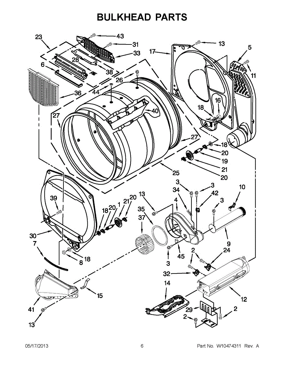 This front drum bulkhead is the stationary front panel that supports the dryer drum and seals the drum opening to maintain proper airflow and drum alignment for reliable drying performance. What it does: