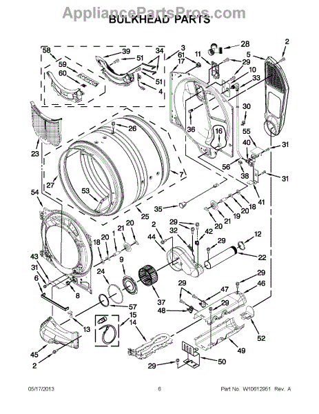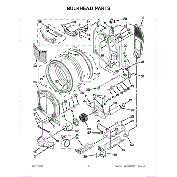 This bulkhead is the front structural panel that supports the dryer drum and seals the front of the cabinet to maintain proper airflow and drum alignment. Replacing a worn bulkhead restores stable drum rotation and prevents air leaks. What it does: