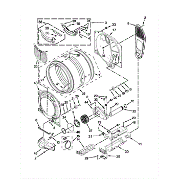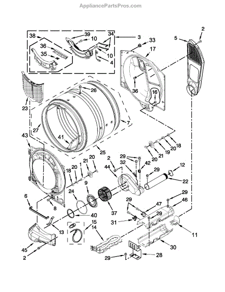 This blower housing assembly replaces the blower chamber that supports the blower wheel and routes air through the dryer for proper tumbling and drying. Restores correct airflow and helps reduce overheating or poor drying performance. What it does: