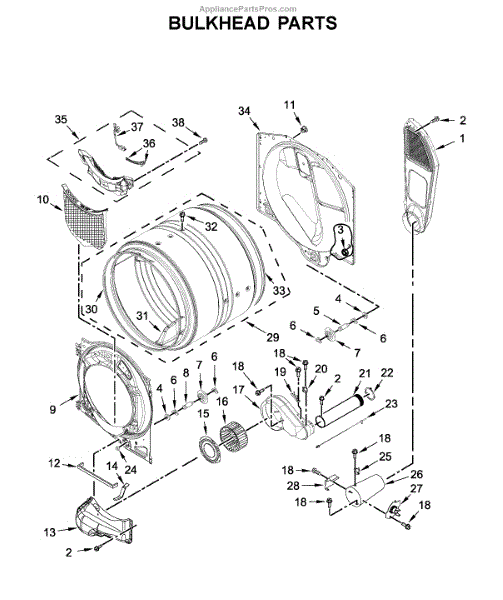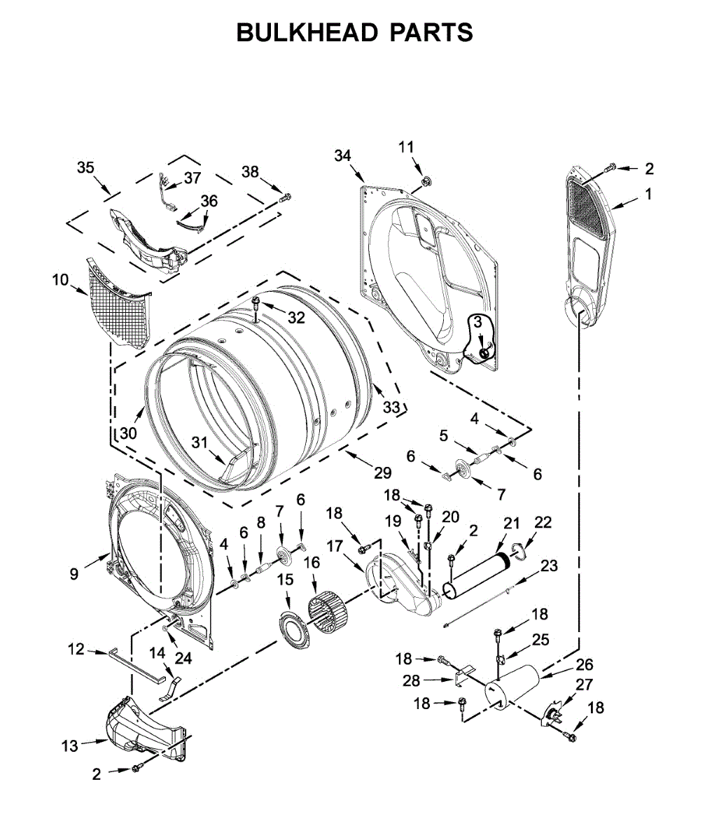 This bulkhead is the front interior panel that supports the drum and helps direct dryer airflow for efficient tumbling and exhaust. It restores proper drum alignment and airflow when the original panel is worn or damaged. What it does: