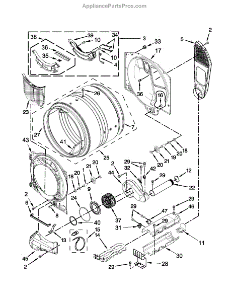 This blower housing assembly replaces the blower chamber that supports the blower wheel and routes air through the dryer for proper tumbling and drying. Restores correct airflow and helps reduce overheating or poor drying performance. What it does: