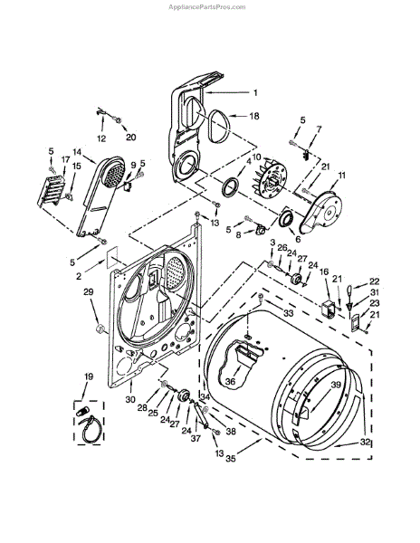 This blower housing assembly directs airflow from the dryer's drum to the exhaust, helping the appliance vent properly for efficient drying. It replaces a damaged or cracked housing to restore correct air path and reduce airflow loss. What it does: