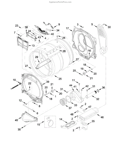 The Housing is an OEM component specifically designed for Whirlpool electric dryers. Found within the rear upper compartment, the square blower housing surrounds and supports the centrifugal fan assembly.