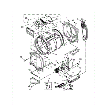 The Housing is an OEM component specifically designed for Whirlpool electric dryers. Found within the rear upper compartment, the square blower housing surrounds and supports the centrifugal fan assembly.