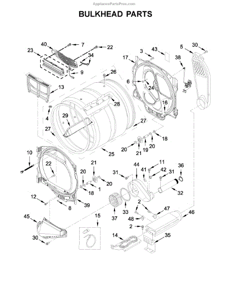 The Housing is an OEM component specifically designed for Whirlpool electric dryers. Found within the rear upper compartment, the square blower housing surrounds and supports the centrifugal fan assembly.