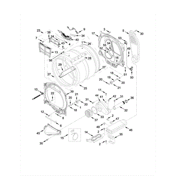 The Housing is an OEM component specifically designed for Whirlpool electric dryers. Found within the rear upper compartment, the square blower housing surrounds and supports the centrifugal fan assembly.