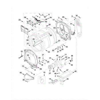 The Housing is an OEM component specifically designed for Whirlpool electric dryers. Found within the rear upper compartment, the square blower housing surrounds and supports the centrifugal fan assembly.