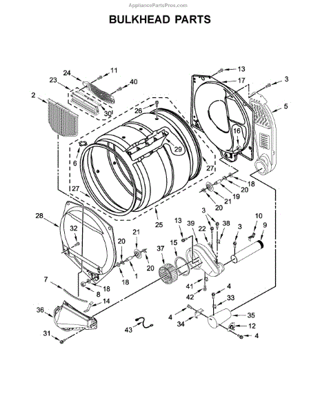 This bulkhead is the front interior panel that supports the drum and helps direct dryer airflow for efficient tumbling and exhaust. It restores proper drum alignment and airflow when the original panel is worn or damaged. What it does:
