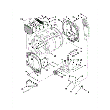 The Housing is an OEM component specifically designed for Whirlpool electric dryers. Found within the rear upper compartment, the square blower housing surrounds and supports the centrifugal fan assembly.