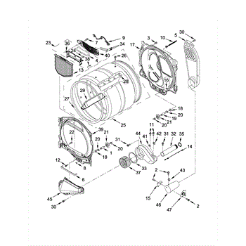 The Housing is an OEM component specifically designed for Whirlpool electric dryers. Found within the rear upper compartment, the square blower housing surrounds and supports the centrifugal fan assembly.