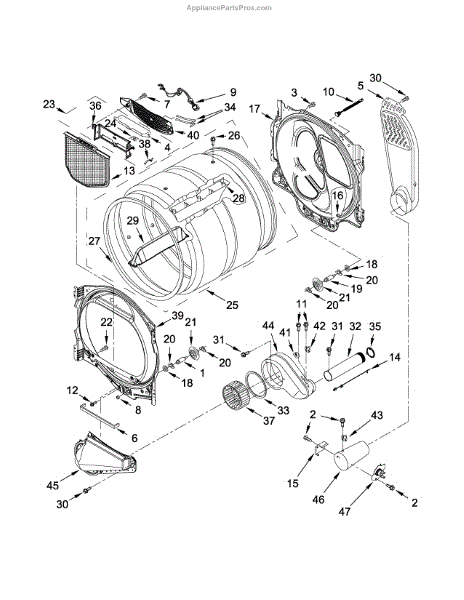 This replacement dryer drum restores the rotating clothes drum that tumbles and contains laundry during drying. It returns the drum surface and shape needed for even tumbling and helps prevent fabric damage from a warped or damaged drum. What it does: