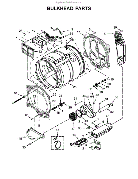 The Housing is an OEM component specifically designed for Whirlpool electric dryers. Found within the rear upper compartment, the square blower housing surrounds and supports the centrifugal fan assembly.