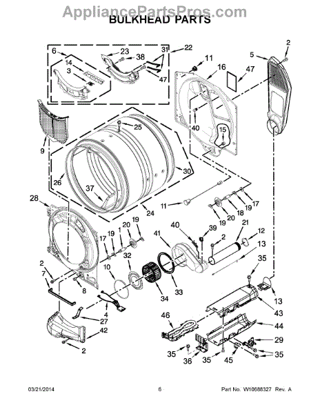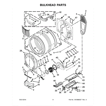 This bulkhead is the front interior panel that supports the drum and helps direct dryer airflow for efficient tumbling and exhaust. It restores proper drum alignment and airflow when the original panel is worn or damaged. What it does: