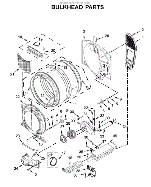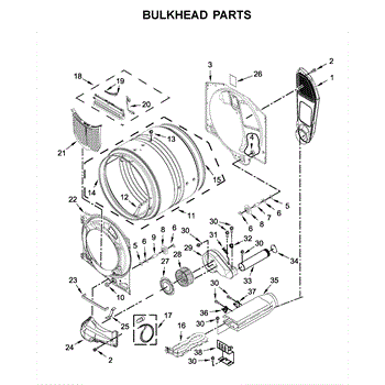 This bulkhead is the front interior panel that supports the drum and helps direct dryer airflow for efficient tumbling and exhaust. It restores proper drum alignment and airflow when the original panel is worn or damaged. What it does: