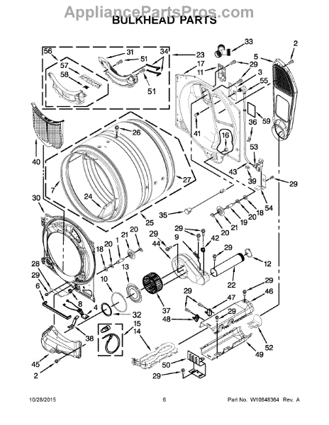 This bulkhead is the front structural panel that supports the dryer drum and seals the front of the cabinet to maintain proper airflow and drum alignment. Replacing a worn bulkhead restores stable drum rotation and prevents air leaks. What it does: