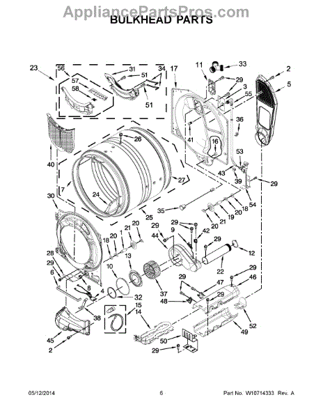 This bulkhead is the front structural panel that supports the dryer drum and seals the front of the cabinet to maintain proper airflow and drum alignment. Replacing a worn bulkhead restores stable drum rotation and prevents air leaks. What it does: