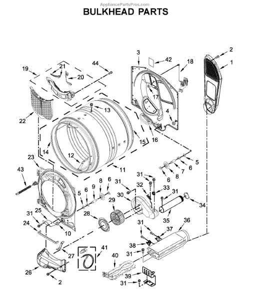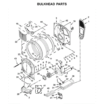 This bulkhead is the front structural panel that supports the dryer drum and seals the front of the cabinet to maintain proper airflow and drum alignment. Replacing a worn bulkhead restores stable drum rotation and prevents air leaks. What it does:
