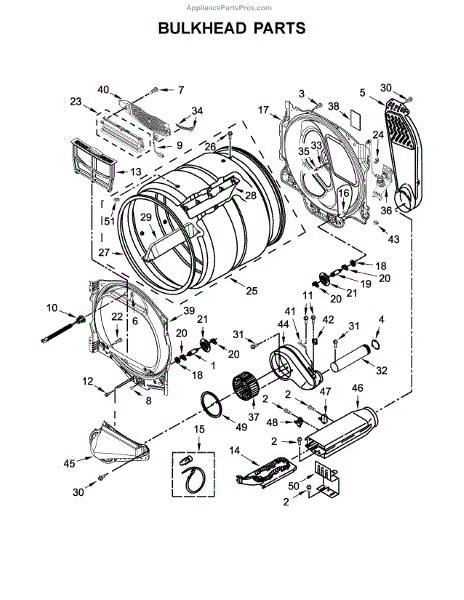The Housing is an OEM component specifically designed for Whirlpool electric dryers. Found within the rear upper compartment, the square blower housing surrounds and supports the centrifugal fan assembly.