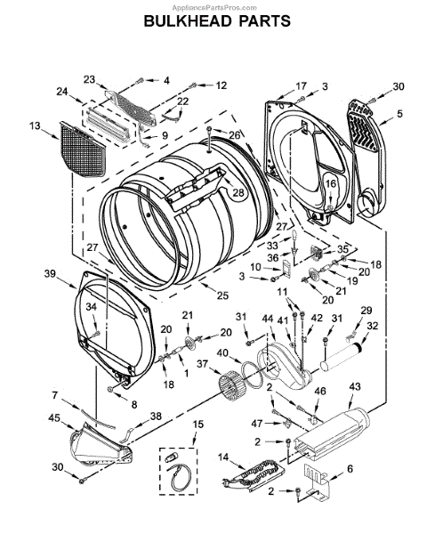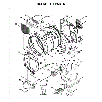 This front drum bulkhead is the stationary front panel that supports the dryer drum and seals the drum opening to maintain proper airflow and drum alignment for reliable drying performance. What it does: