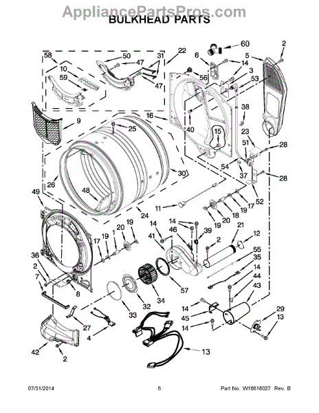 This bulkhead is the front structural panel that supports the dryer drum and seals the front of the cabinet to maintain proper airflow and drum alignment. Replacing a worn bulkhead restores stable drum rotation and prevents air leaks. What it does: