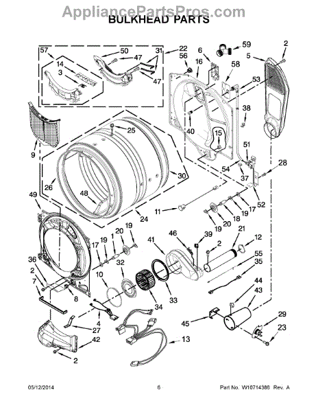 This bulkhead is the front structural panel that supports the dryer drum and seals the front of the cabinet to maintain proper airflow and drum alignment. Replacing a worn bulkhead restores stable drum rotation and prevents air leaks. What it does: