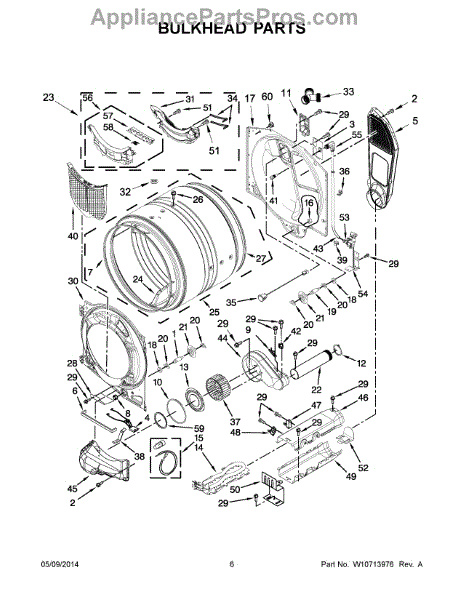 This bulkhead is the front structural panel that supports the dryer drum and seals the front of the cabinet to maintain proper airflow and drum alignment. Replacing a worn bulkhead restores stable drum rotation and prevents air leaks. What it does:
