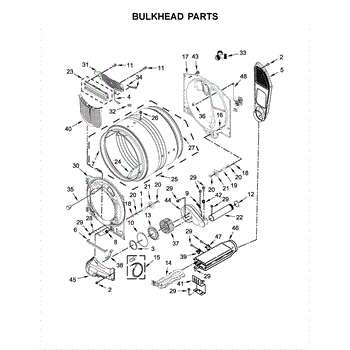 This bulkhead is the front structural panel that supports the dryer drum and seals the front of the cabinet to maintain proper airflow and drum alignment. Replacing a worn bulkhead restores stable drum rotation and prevents air leaks. What it does: