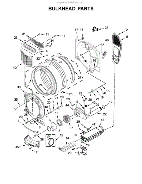 This bulkhead is the front interior panel that supports the drum and helps direct dryer airflow for efficient tumbling and exhaust. It restores proper drum alignment and airflow when the original panel is worn or damaged. What it does: