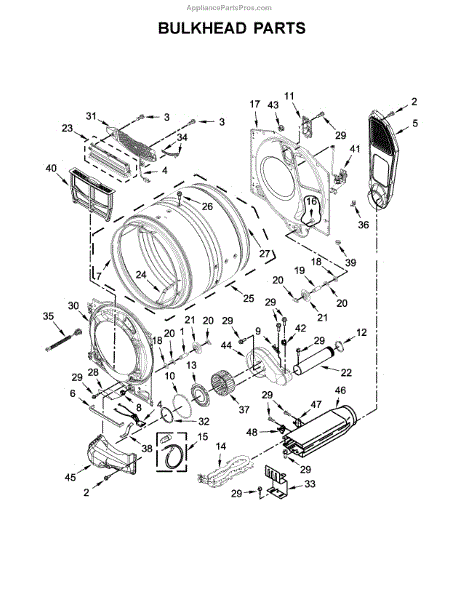 This bulkhead is the front structural panel that supports the dryer drum and seals the front of the cabinet to maintain proper airflow and drum alignment. Replacing a worn bulkhead restores stable drum rotation and prevents air leaks. What it does: