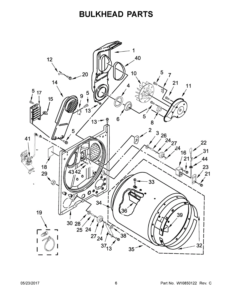 The Push Clip is an OEM replacement part for Whirlpool dryers. Situated internally near the rear cylinder wall, it firmly secures the drum support roller assembly. Causes of failure relate to fatigue from years of absorbing drum impacts and associated mechanical stresses. Corrosion penetration if moisture enters the clip mounting area increases operational resistance over time as well. Symptoms consist of:
