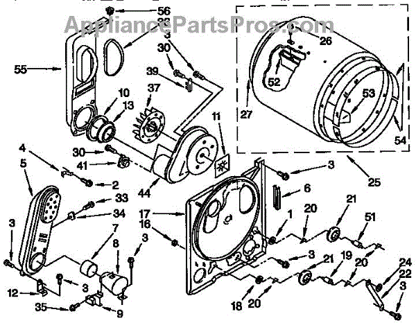 Over time, the drum baffle can become loose or damaged due to frequent use and contact with clothing or objects left in pockets. Physical wear or repeated impacts might cause it to crack, detach, or warp, reducing its ability to tumble clothes properly.