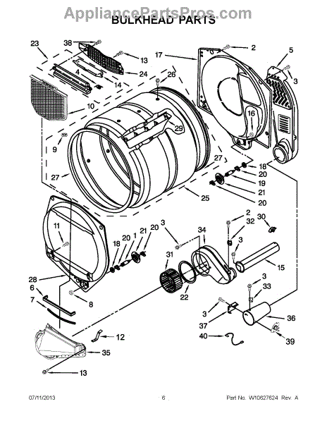 This bulkhead is the front interior panel that supports the drum and helps direct dryer airflow for efficient tumbling and exhaust. It restores proper drum alignment and airflow when the original panel is worn or damaged. What it does: