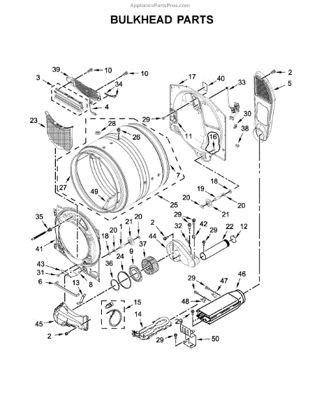 This bulkhead is the front structural panel that supports the dryer drum and seals the front of the cabinet to maintain proper airflow and drum alignment. Replacing a worn bulkhead restores stable drum rotation and prevents air leaks. What it does: