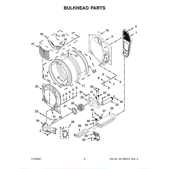 This bulkhead is the front interior panel that supports the drum and helps direct dryer airflow for efficient tumbling and exhaust. It restores proper drum alignment and airflow when the original panel is worn or damaged. What it does: