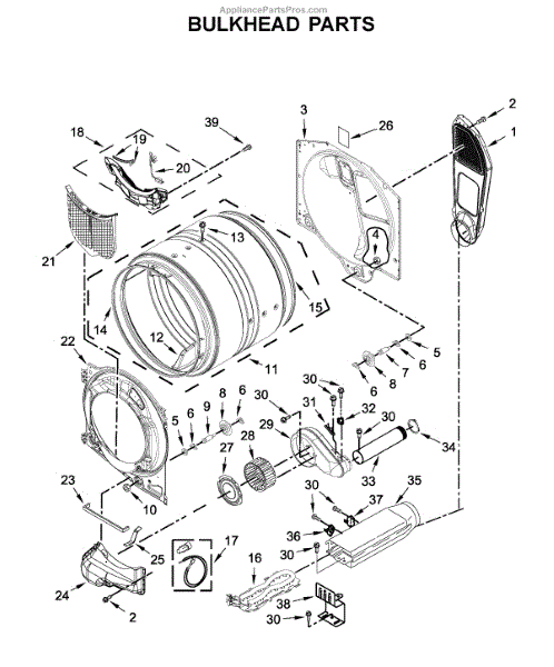 This bulkhead is the front interior panel that supports the drum and helps direct dryer airflow for efficient tumbling and exhaust. It restores proper drum alignment and airflow when the original panel is worn or damaged. What it does: