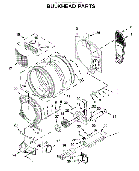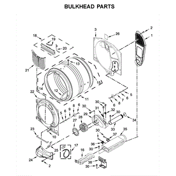 This bulkhead is the front interior panel that supports the drum and helps direct dryer airflow for efficient tumbling and exhaust. It restores proper drum alignment and airflow when the original panel is worn or damaged. What it does: