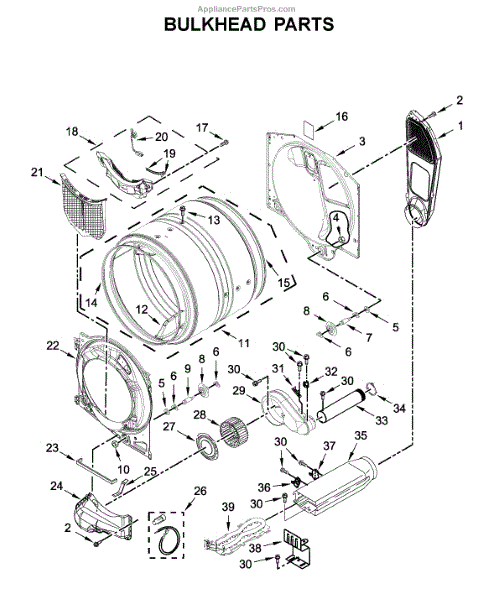 This bulkhead is the front interior panel that supports the drum and helps direct dryer airflow for efficient tumbling and exhaust. It restores proper drum alignment and airflow when the original panel is worn or damaged. What it does:
