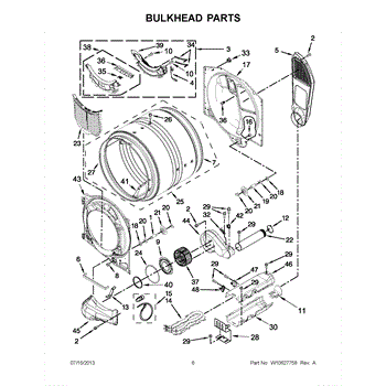 This bulkhead is the front interior panel that supports the drum and helps direct dryer airflow for efficient tumbling and exhaust. It restores proper drum alignment and airflow when the original panel is worn or damaged. What it does: