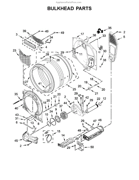 A replacement front drum bulkhead that supports the dryer drum and helps keep the front bearing and seal aligned for smooth rotation. Use this bulkhead to restore proper drum alignment and reduce rubbing, noise, and excessive front play. What it does: