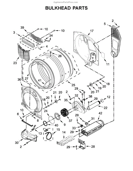 This bulkhead is the front interior panel that supports the drum and helps direct dryer airflow for efficient tumbling and exhaust. It restores proper drum alignment and airflow when the original panel is worn or damaged. What it does: